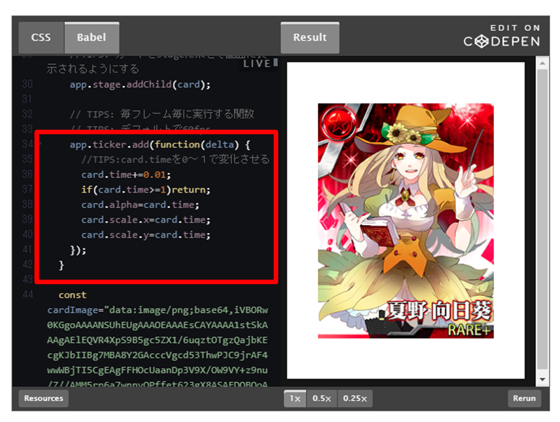 試しに、下図の赤枠内にあるcard.time+=0.01;の 「0.01」から「0.001」に変更して、Returnボタンを押してみてください。