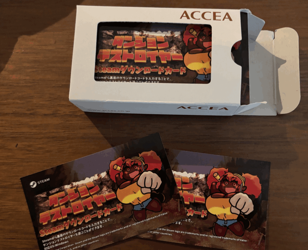 今回メイン展示であるダンジョンデストロイヤーですが、前回ゲムダン9の後にリリースすることができた作品です。今回のゲムダン10が最後の展示になるので、せっかくならば体験版の展示だけでなくゲームの手売りもしたいと思い、ダウンロードカード(DLカード)を作成しました。