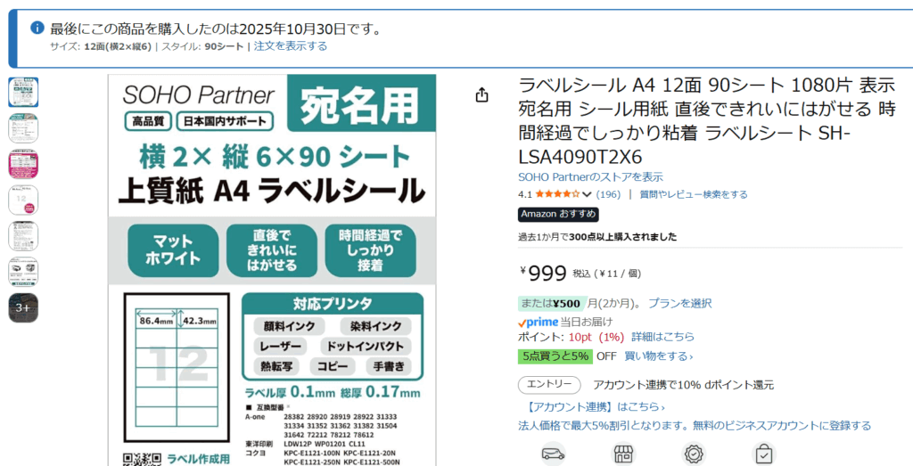 変更文字列を考慮して印刷する方法をバリアブル印刷と呼ぶのですが、これまた単価が高かったので、以下のA4シール紙を購入して印刷することにしました。