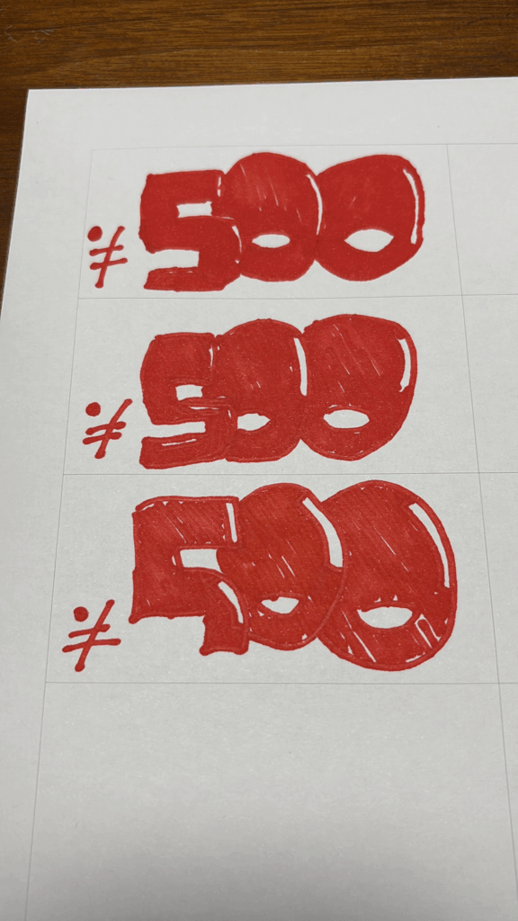 ちなみに余談ですが、このシールを流用してドンキホーテpopを参考に値札popを作成しました。