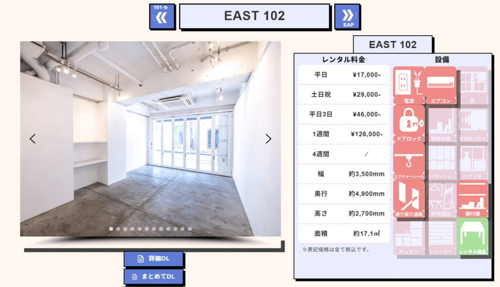 このゆるゲー展は出展者がみんな有名クリエイターだったこともあり、結構人が集まったようです。自分には集客力はないので、せめて1Fの道路沿いのスペースを借りられないか調べていたところ、この画像の右側にあるスペース、EAST102というスペースを借りることができました。