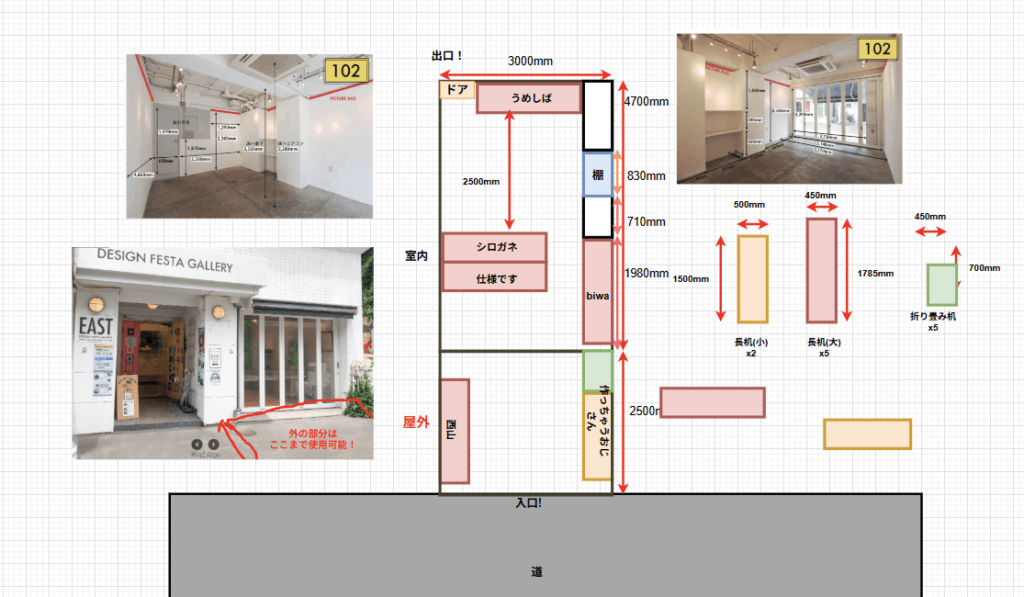 場所が予約できたので、レイアウトのために寸法図を作ります。
