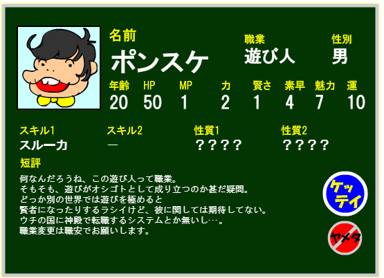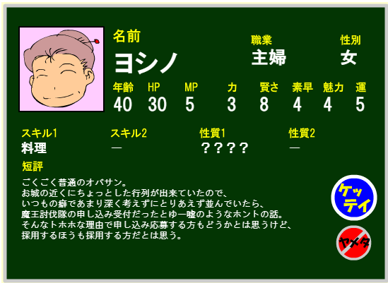 最初は誰が選ぶのかと思っていた主婦ヨシノと遊び人ポンスケ。後半になると積極的に登用するようになり、その価値観の変化がとても興味深くて面白かったゲームでした。